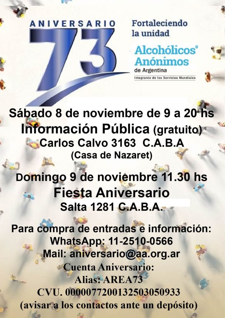 Compartimos con ustedes información sobre el 73 aniversario de la comunidad en Argentina. Cualquier duda o sugerencias dirigirse al WhatsApp 11- 2510-0566 o al mail aniversario@aa.org.ar
